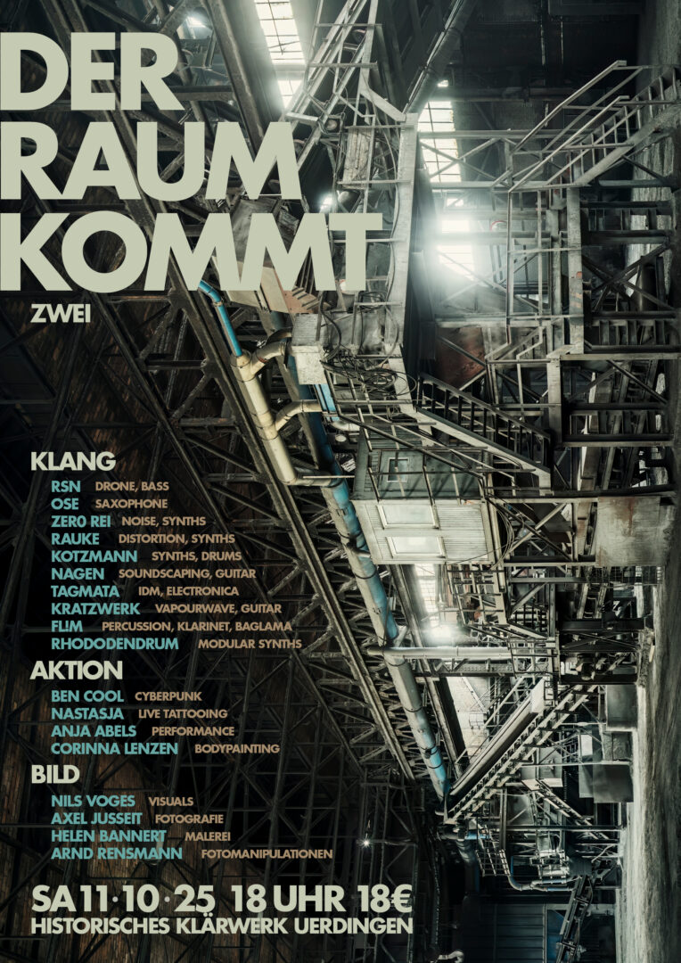 Fotograf Axel Jusseit hatte 2024 eine Vernissage seiner Arbeiten im Historischen Klärwerk initiiert, zu der doch experimentelle Musik passen könnte. Also formte ich (NAGEN) zusammen mit Fabian Kieven (Tagmata) und Guido Richter (Tagmata) ein infernalisches Trio um die Ausstellung düster und frei improvisiert akustisch zu untermalen. Axel lud mit Corinna Lenzen noch eine Bodypainterin ein, die während unserer musikalischen Performance zwei Models bearbeitete, die anschließend durch das Klärwerk wandelten. „DER RAUM KOMMT“ basiert auf einem O-Ton-Sample aus einer Theaterinszenierung, was ich gerne in meinen Performances einarbeite – auch passt es natürlich perfekt zur Location.