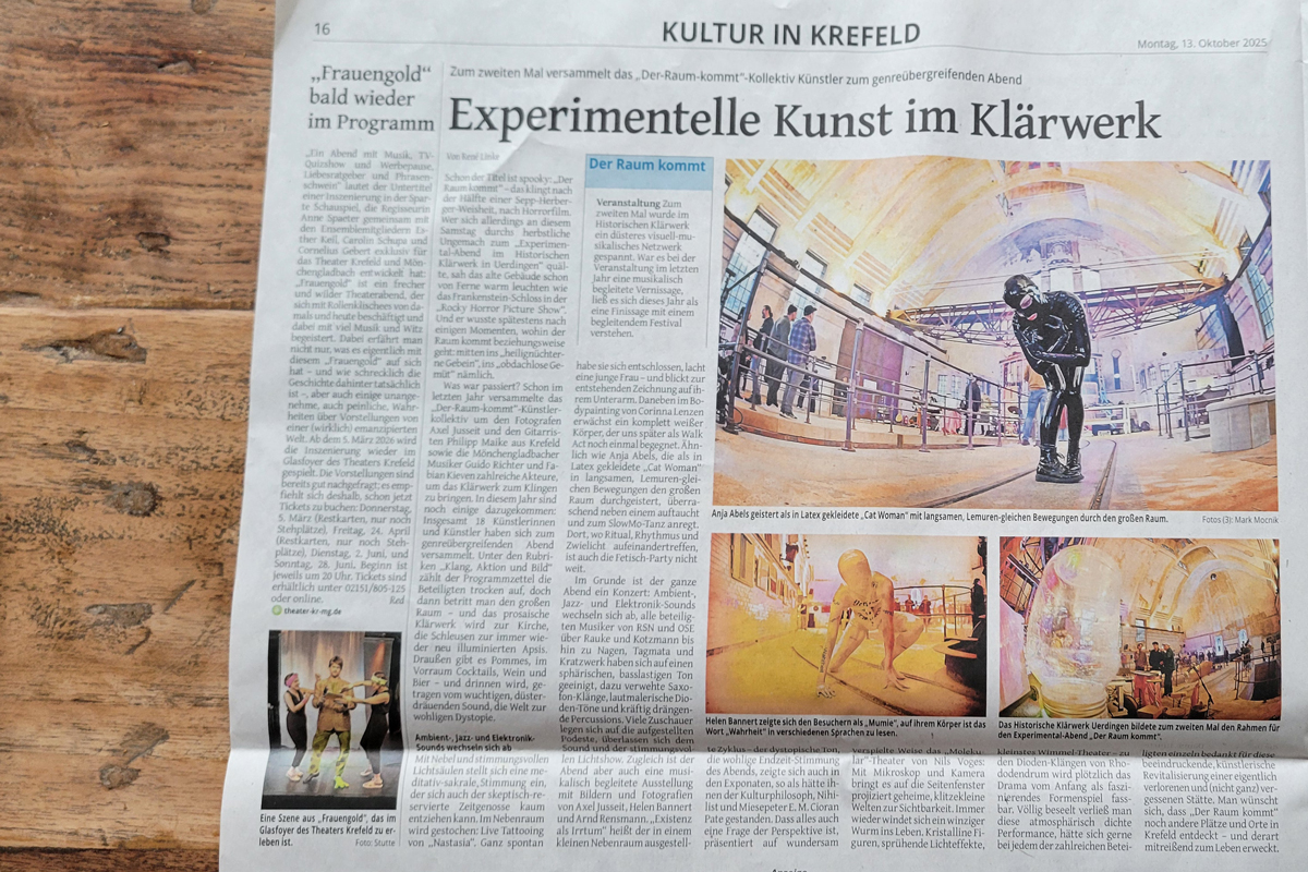 Für die Veranstaltungen habe ich Flyer und Plakate auf Basis von Axels Fotos gestaltet und ein wenig Pressearbeit gemacht. 2025 ist so auch ein wirklich opulenter und überaus wohlwollender Beitrag in der Westdeutschen Zeitung erschienen. Ein Ritterschlag. (s. unten)