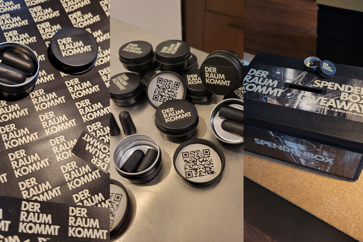Außerdem fertigte ich noch ein kleines Giveaway für die Besucher an: Schwarze Ohrenstöpsel in einer kleiner schwarzen Dose für die Hosentasche mit einer QR-Code zur Weiterleitung zu den Seiten der Artists.