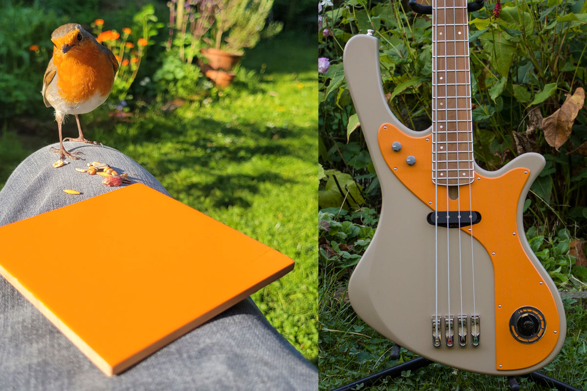 Als ein letztes Projekt als Designer bei BassLine habe ich ein Instrument der re:belle series dem Rotkehlchen gewidmet. Die exakten Farben habe ich meinen Fotos entnommen und extra dafür Lacke anmischen lassen. Außerdem kommen hier ausschließlich heimische Hölzer zum Einsatz wie zum Beispiel schön gemaserte Elsbeere als Hals- und Griffbrettmaterial. Ein natürlich braun-roter Farbton, wie er auch im Gefieder des Vogels vorkommt. Ein sogenanntes weißes „Binding“ an der Griffbrettkante greift den weißen Streifen im Gefieder von Sabine auf, der bei ihr besonders ausgeprägt war.