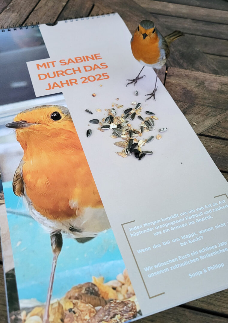 Also ist aus zwölf dieser Fotos ein „Sabine-Kalender“ für das Jahr 2025 geworden, den wir an Weihnachten 2024 an Freunde und die Familie verschenkt haben. Mit allerlei Wissenswertem über Rotkehlchen im allgemeinen und mit Anekdoten von Sabine im speziellen.